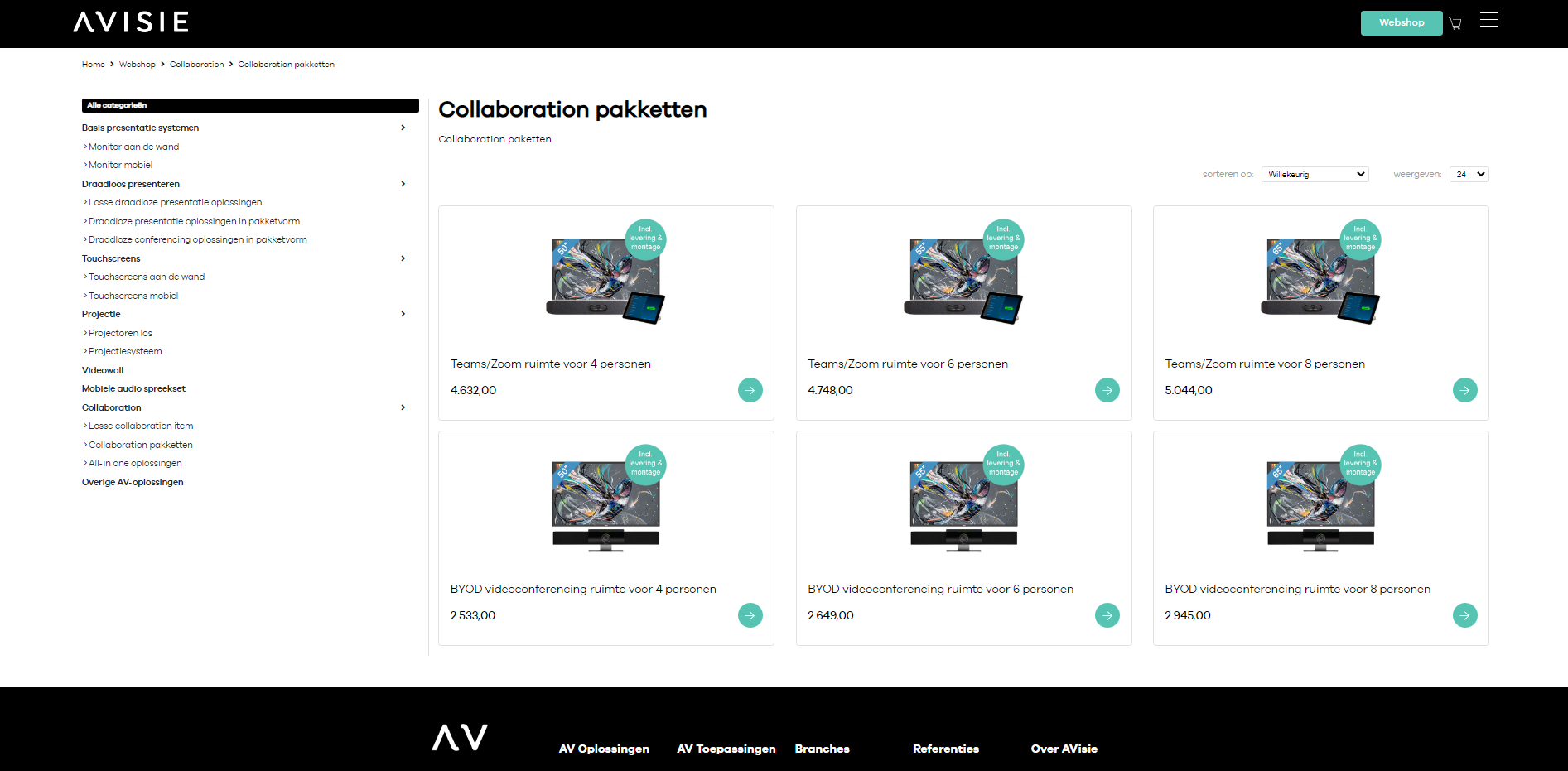 De webshop van AVisie bestaat niet alleen uit losse oplossingen voor videoconferencing, presenteren of digitale signage maar bevat ook kant-en-klare pakketten inclusief installatie die kunnen worden afgenomen om jouw vergaderruimte direct van de juiste totaaloplossing te voorzien. Een afgesproken prijs vooraf en een kwalitatief hoogwaardige oplossing; ontzorging van A tot Z.