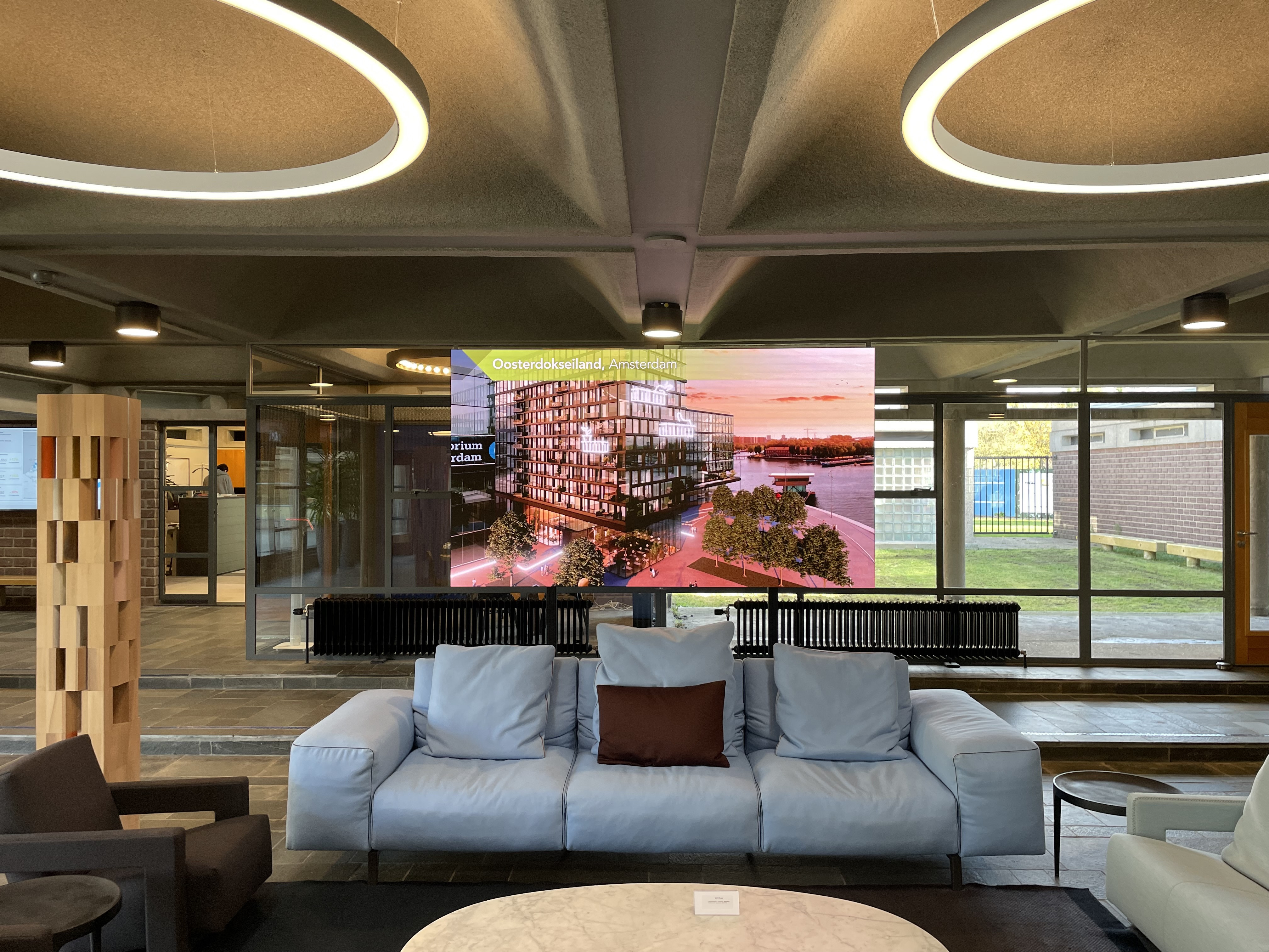 Om deze wensen goed te kunnen invullen, hebben we gekozen voor een all-in-one LED oplossing van LG. Deze 130inch (bijna drie meter breed) oplossing is ook in daglicht perfect leesbaar en is standaard voorzien van imponerende audio.