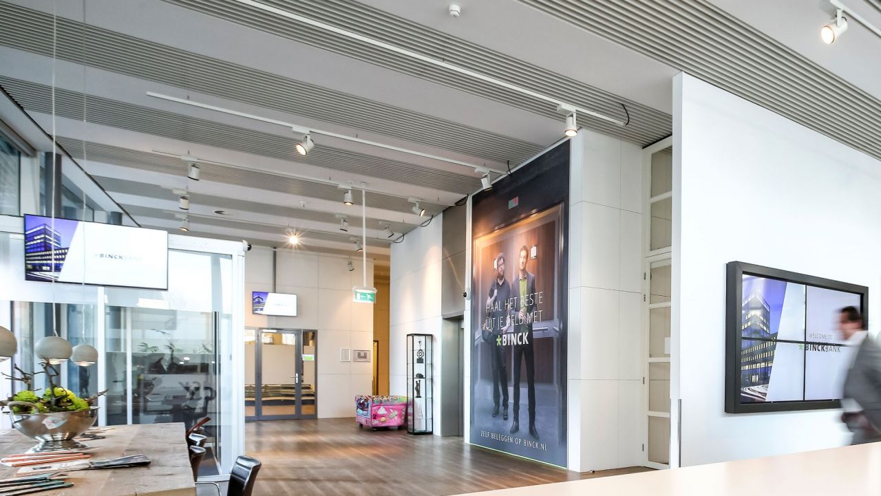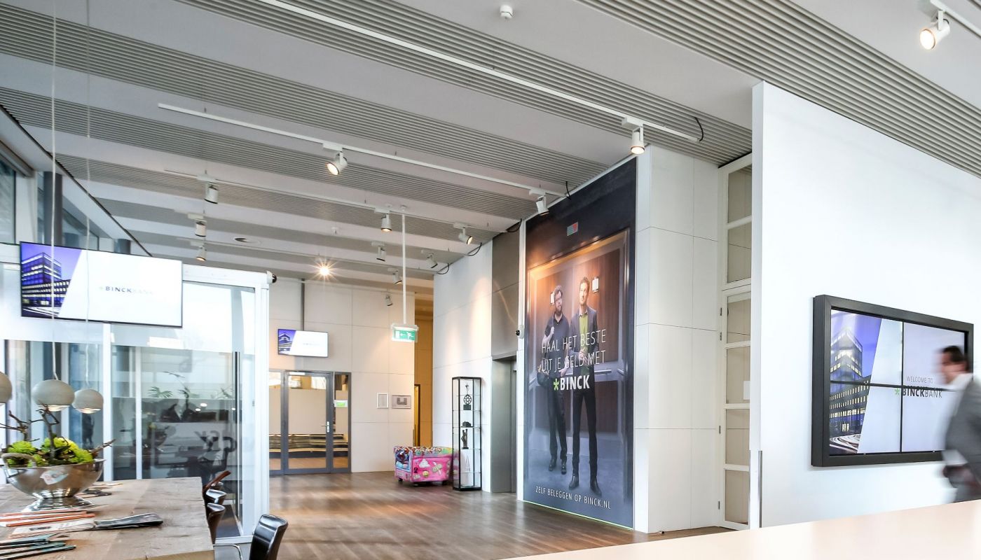 Mede door dit succes kwam de wens om het huidige aantal schermen uit te breiden en lag hierbij de focus op het informeren van de medewerkers. Toen recentelijk in alle presentatieruimten bij BinckBank Amsterdam een audiovisuele update werd uitgevoerd, is de uitbreiding van digital signage direct meegenomen.