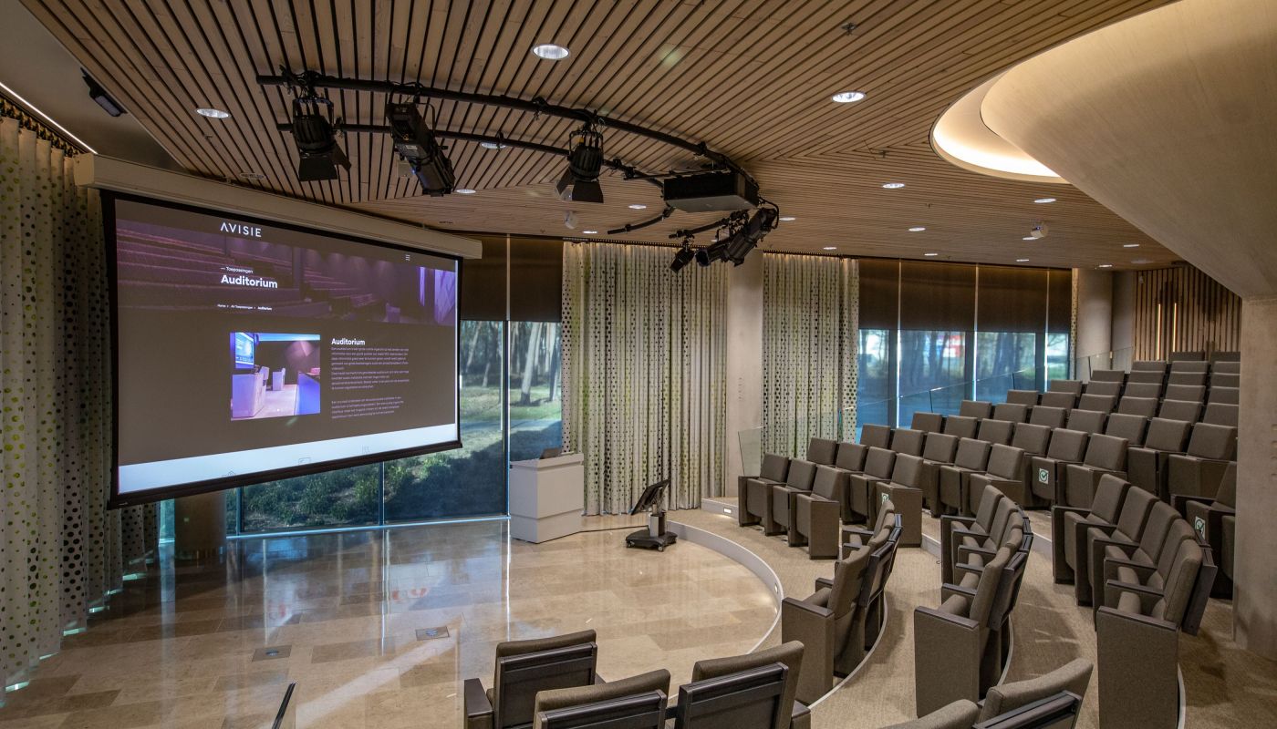 Het auditorium is voorzien van een tensioned projectiescherm in combinatie met een Fosfor-laser projector met maar liefst 20.000 ANSI-lumens. Dit was nodig om de lichtinval van de grote raampartijen te compenseren en een goed zichtbaar beeld te genereren. Het auditorium beschikt over diverse aansluitpunten en kan vanaf meerdere locaties bediend worden. Alle signaaldistributie is middels AV-over-IP ingericht, wat inhoudt dat men beschikt over een volledige matrix functionaliteit als het gaat om de verdeling van de bronweergave.