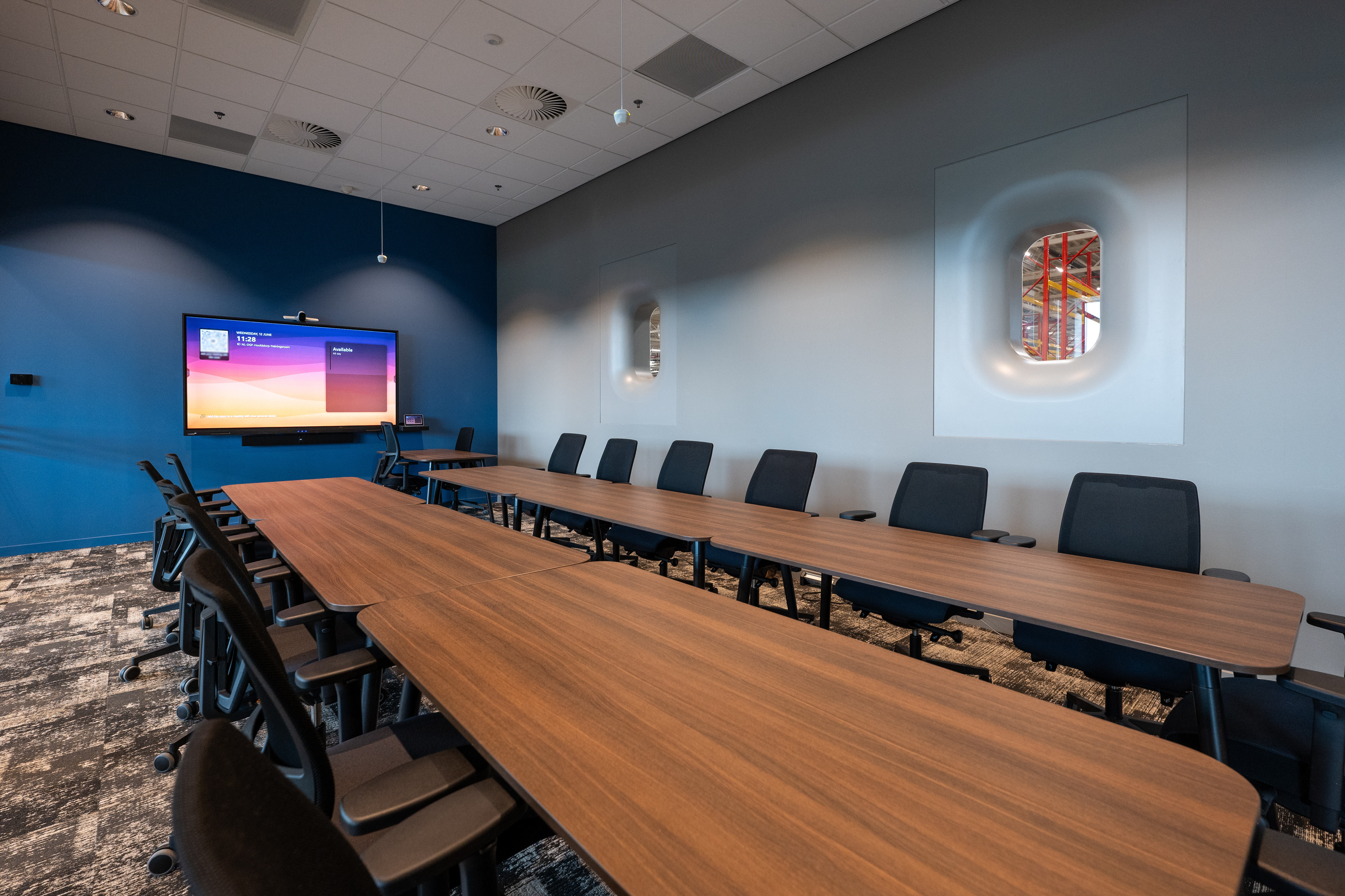 De trainingsruimte is voorzien van Biamp plafondmicrofoons en een Poly E70 camera met speakertracking, ondersteund door een Microsoft Teams Room Systeem van Poly. Dit zorgt voor een naadloze leer- en samenwerkingsomgeving.