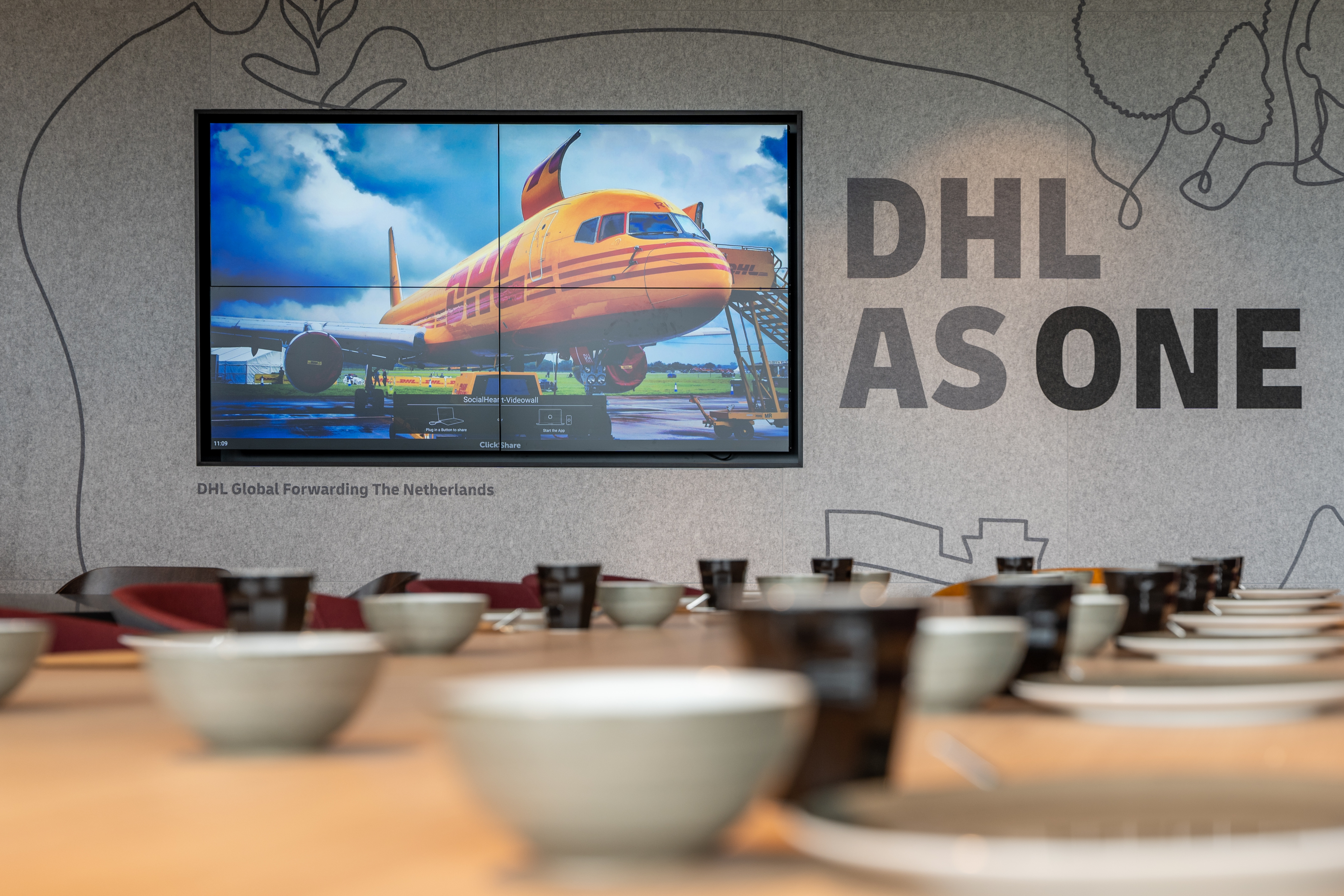Het Social Heart, het restaurant van DHL Global Forwarding, heeft nu een 110 inch videowall en een geavanceerde audio-installatie, inclusief radio, microfoon en draadloos presenteren. Het is nu een ontmoetingspunt voor ideeën en interactie.