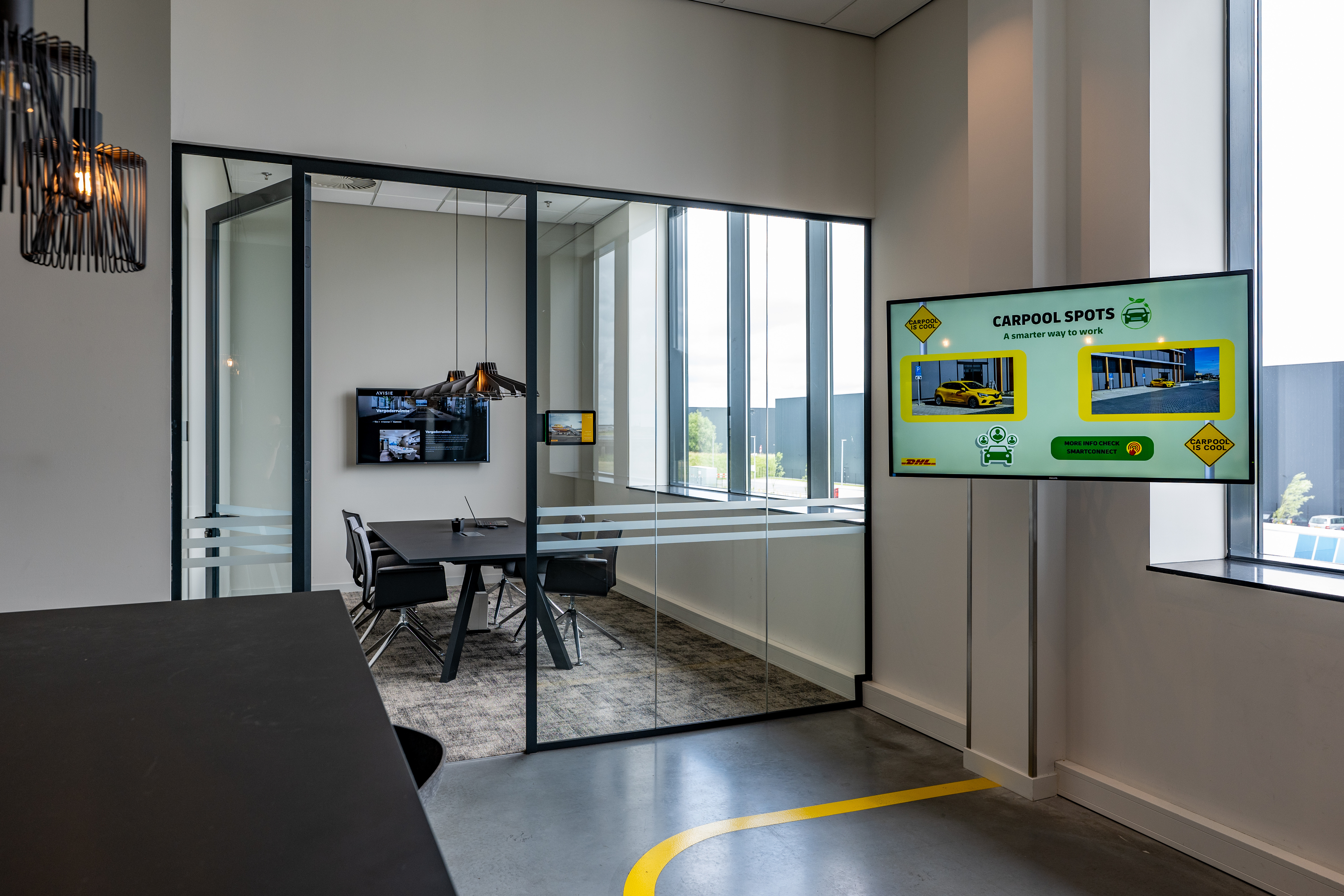 Door het hele gebouw hebben we meerdere displays geïnstalleerd voor digitale signage (narrowcasting), wat zorgt voor heldere, visuele communicatie voor zowel medewerkers als bezoekers.
