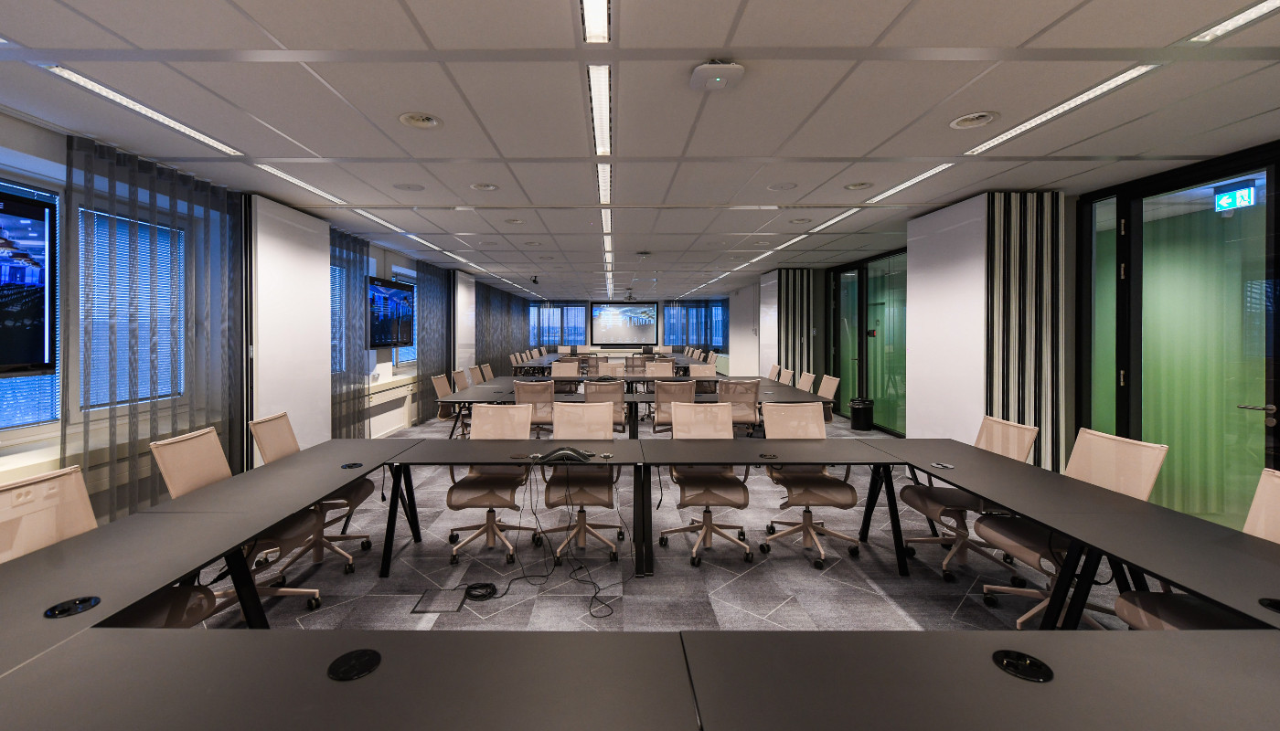 Het kantoor is onder andere voorzien van een drietal aaneengesloten koppelbare vergaderzalen, een ruimte ingericht voor