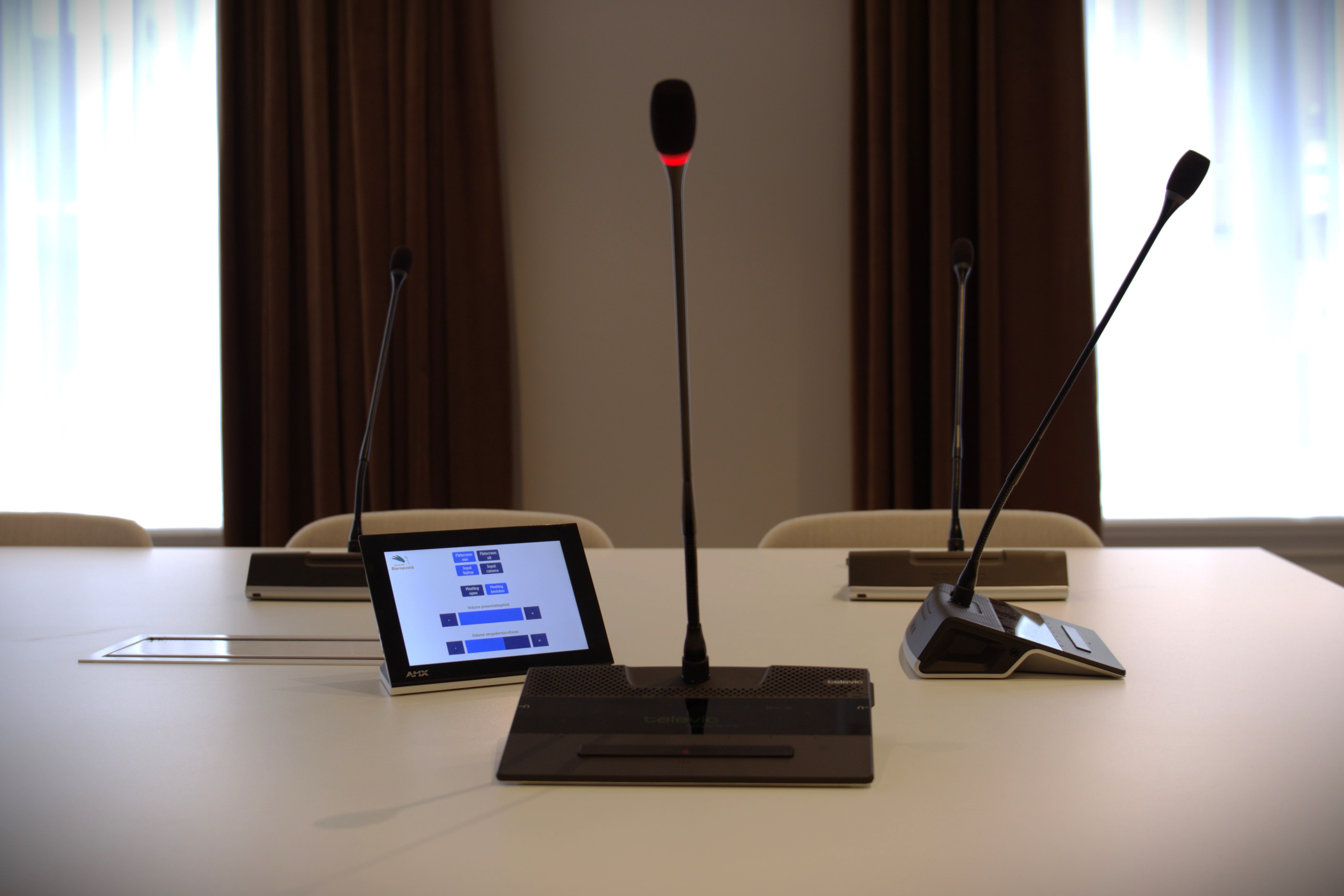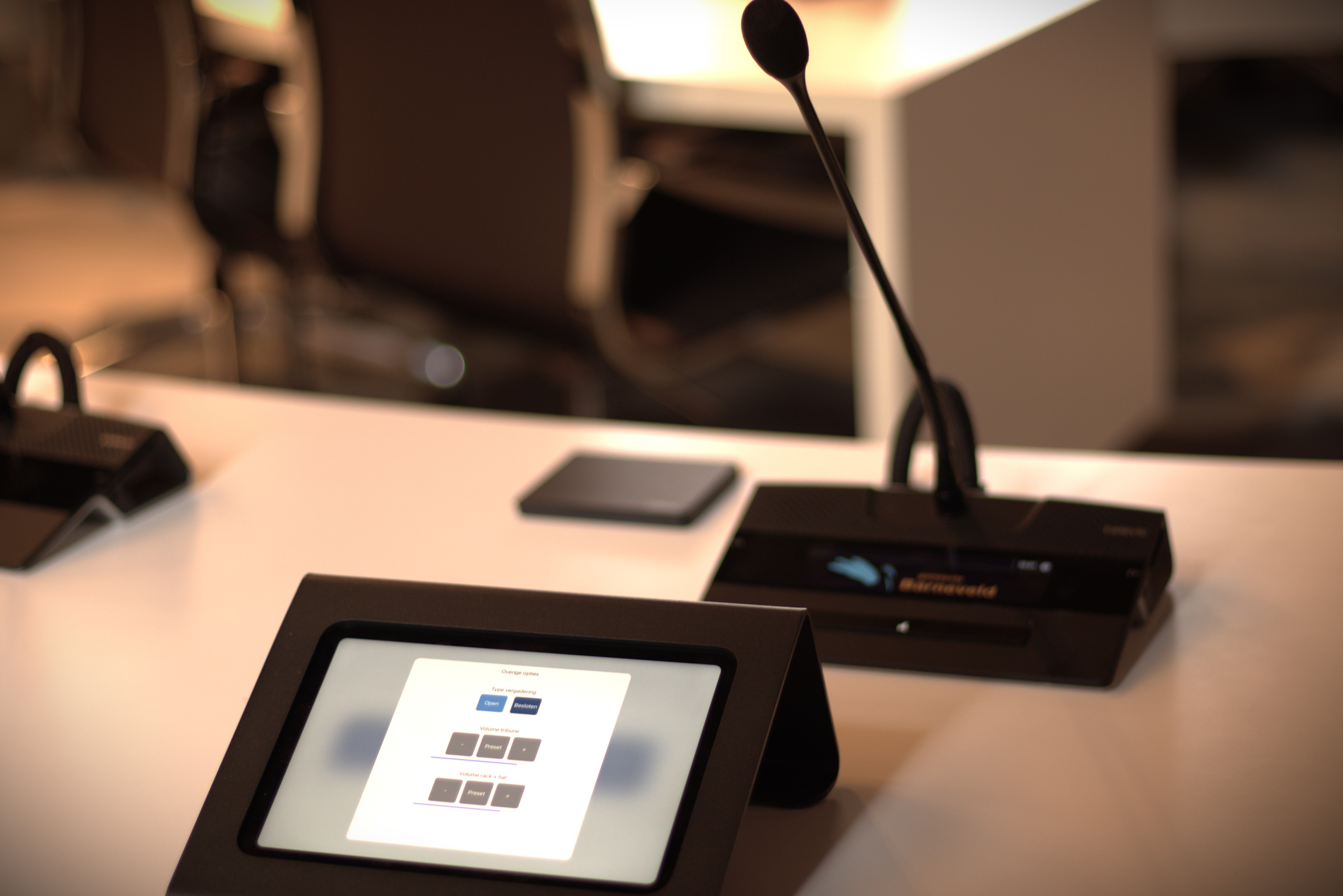De commissiekamer is in dezelfde stijl en kwaliteit ingericht, met een draadloos discussiesysteem, twee camera’s, een strak ingebouwd scherm en eenvoudige bediening. Zo blijft de gebruikservaring overal gelijk, en zijn beide ruimten flexibel inzetbaar voor uiteenlopende vergadersituaties.