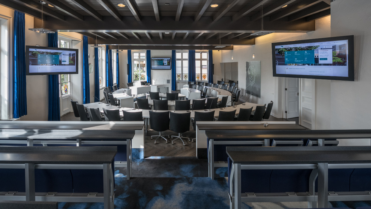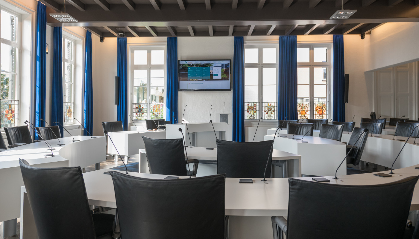 De afgelopen jaren hebben wij ons "eigen” gemeentehuis en diens vergaderruimten mogen voorzien van flatscreens (in vaste en verrijdbare opstellingen) variërend in grootte van 55 tot 75 inch. Een gemeentehuis is geen écht gemeentehuis zonder de raadzaal; de vergaderruimte van het hoogste orgaan van de gemeente.