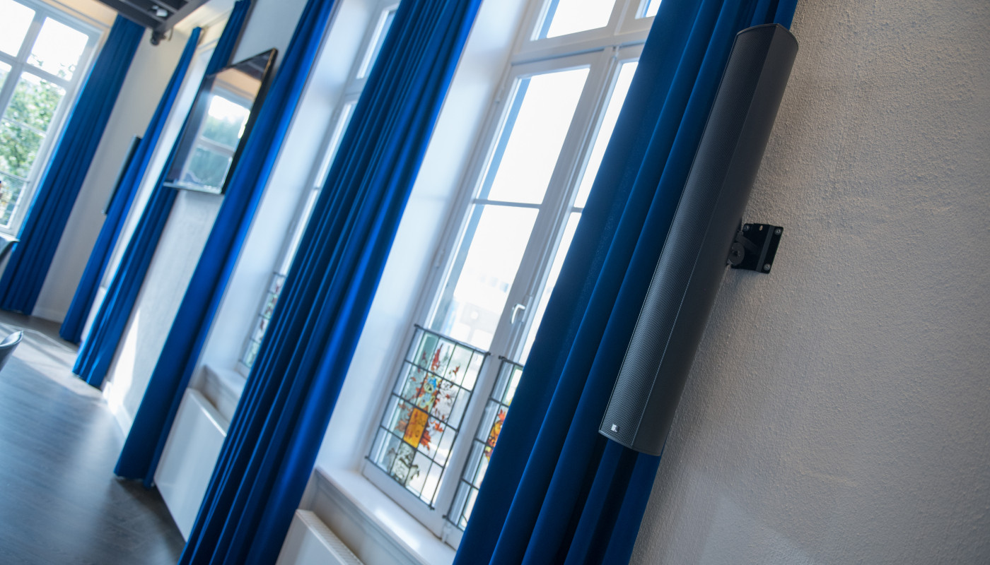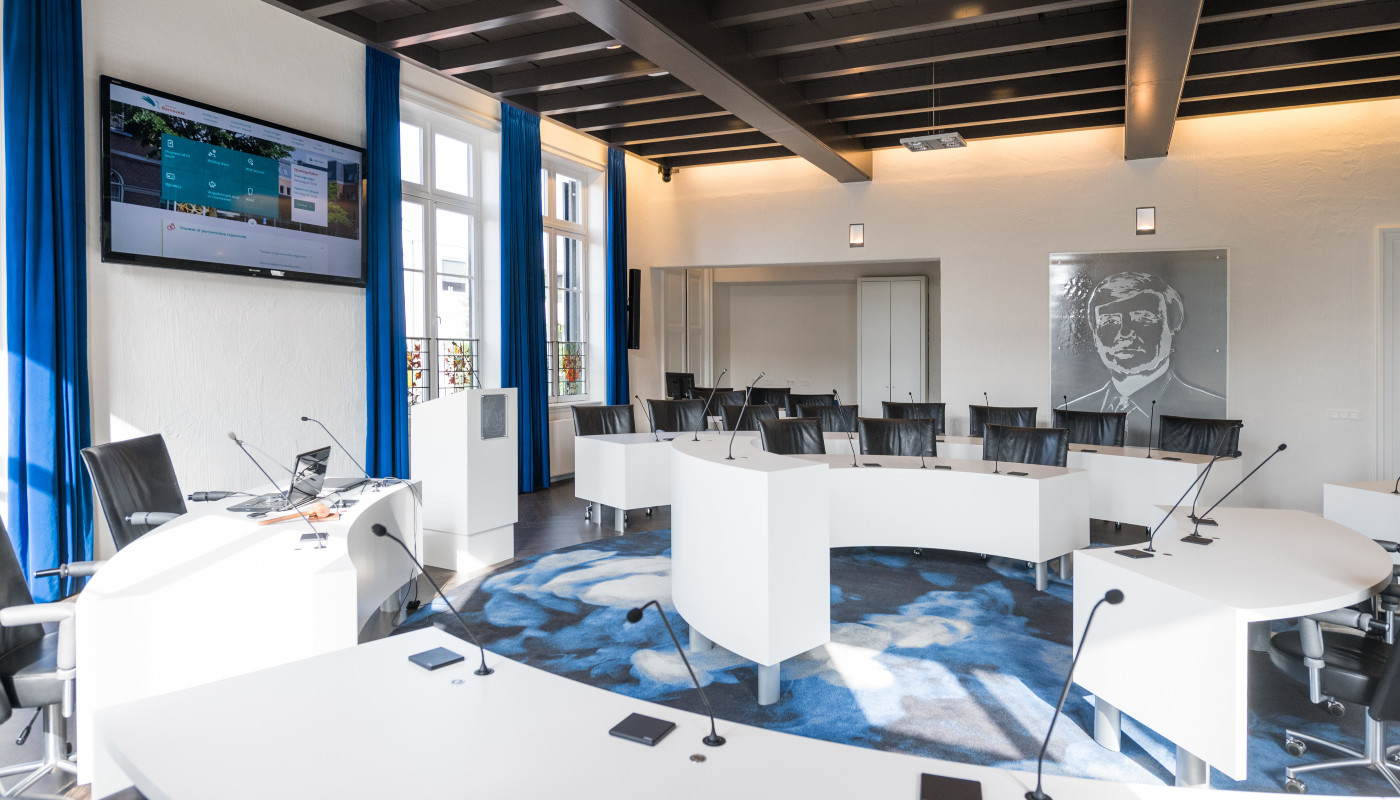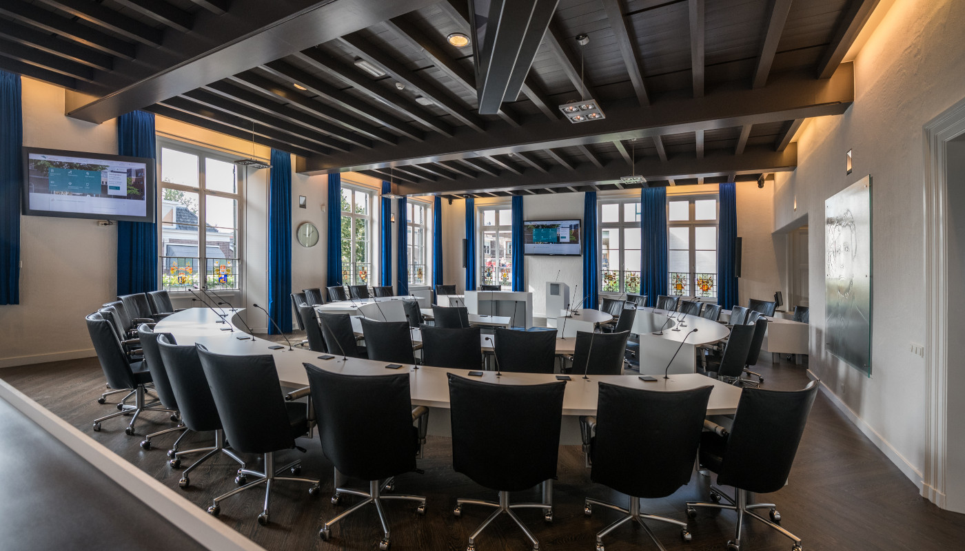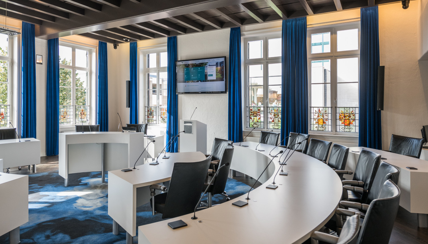 Onlangs mochten wij de raadzaal reviseren. Deze zaal werd uitgerust met een BeyerDynamic Orbis discussiesysteem inclusief camera registratie. Dit draadgebonden discussiesysteem maakt gebruik van standaard CAT-5 kabels die een kosteneffectieve installatie mogelijk maken. Om presentaties te ondersteunen is er gekozen voor een 80 inch Sharp monitor. Gezien de grootte van de ruimte is er eveneens voorzien in een tweetal kleiner formaat Sharp monitoren inclusief behuizing voor beeldondersteuning. De audioweergave wordt verzorgd door hoogwaardige Fohhn luidsprekers. Om de bediening van de audiovisuele apparatuur zo vlekkeloos mogelijk te laten verlopen, is er gekozen voor ons eigen AVcontrol besturingssysteem door middel van een iPad mini.
