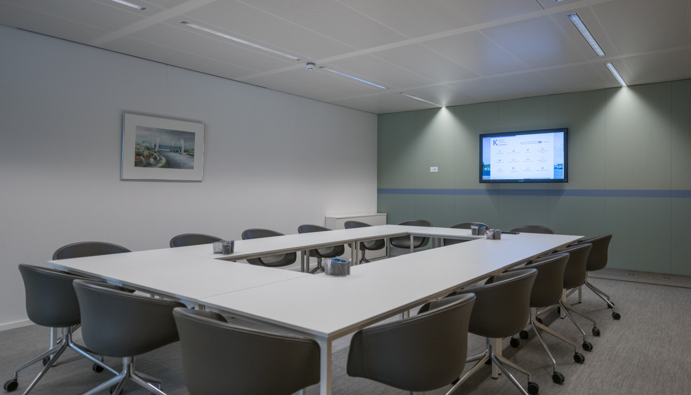 videowall bestaande uit 55 inch monitoren. De hoogwaardige audio is in de akoestische achterwand verwerkt waardoor de zaal een zogeheten “cleane” uitstraling krijgt.