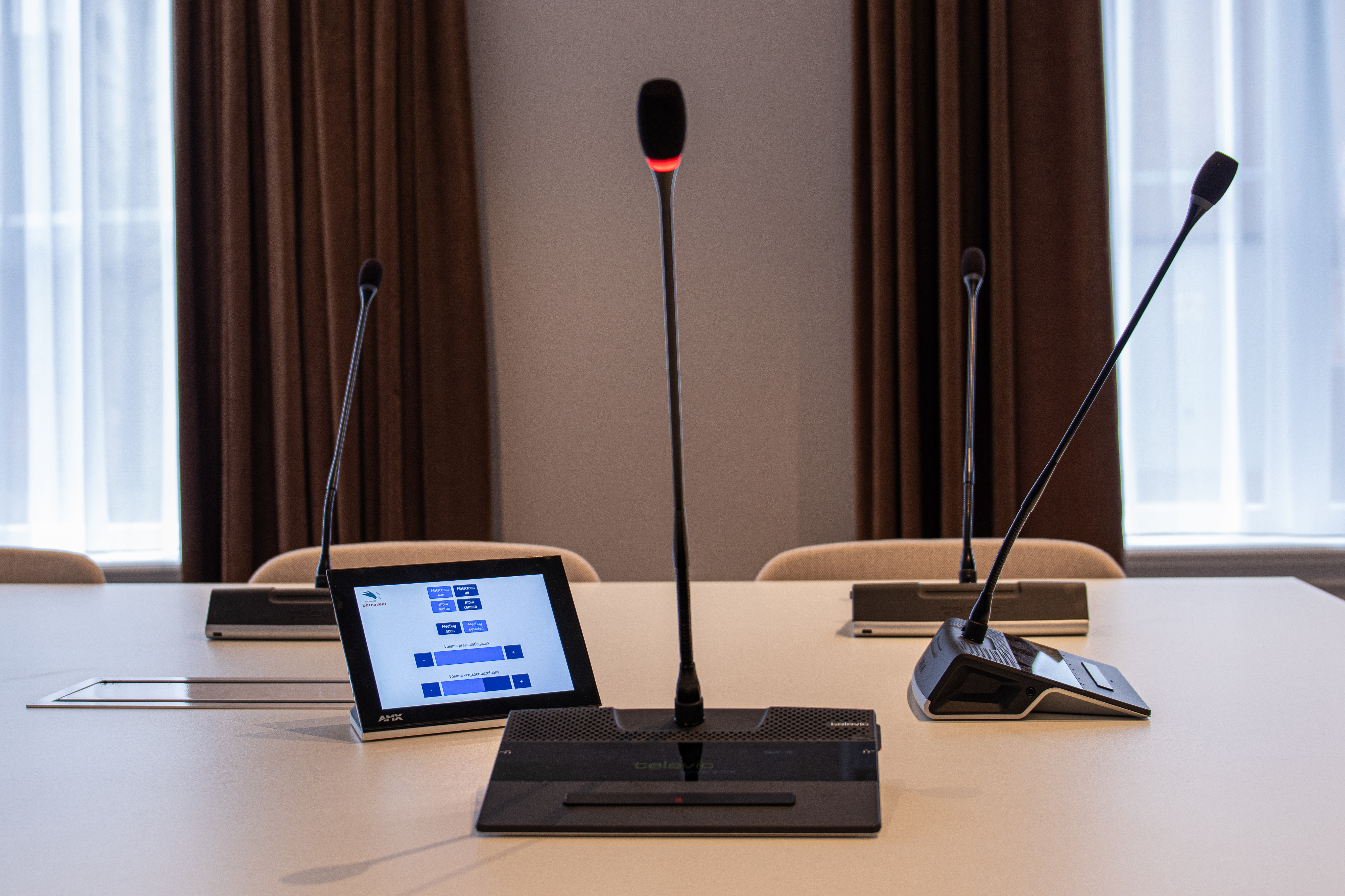 Grote schermen en een draadloos Televic-discussiesysteem voor soepele vergaderingen.
