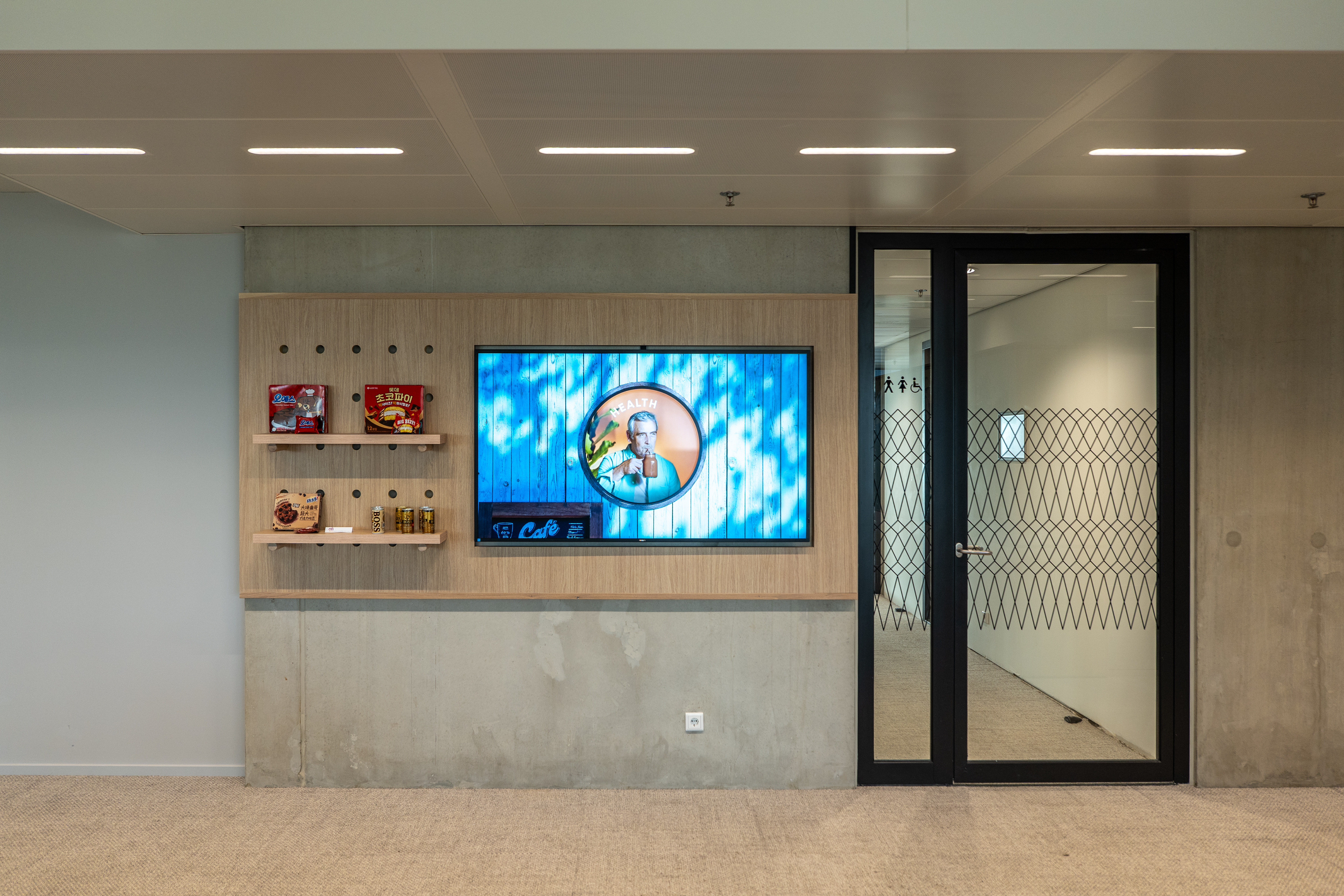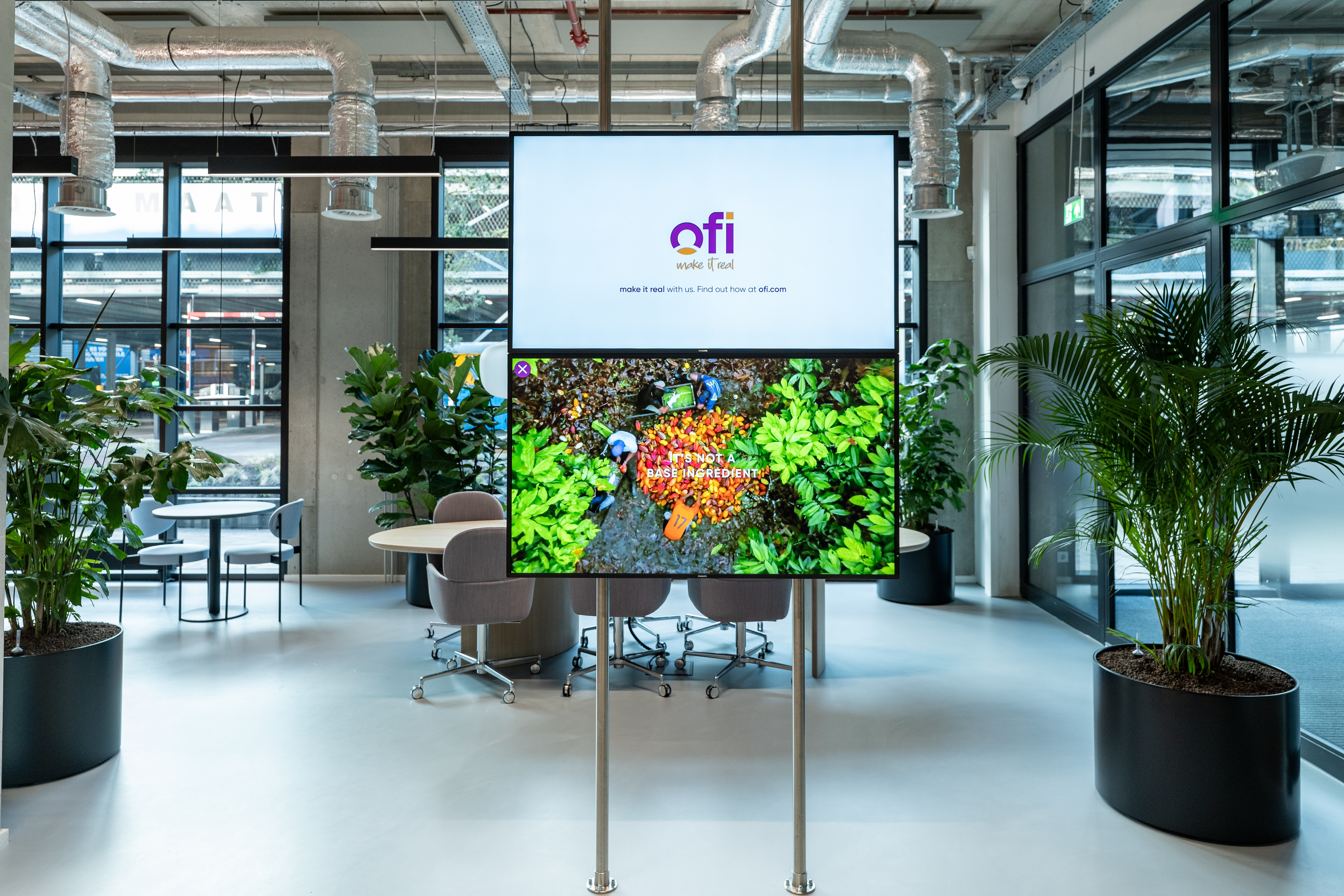 Voor communicatiedoeleinden hebben we een narrowcasting systeem geïmplementeerd, met monitoren op strategische plekken om te kunnen communiceren met medewerkers en gasten van ofi.