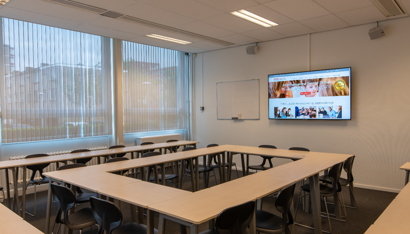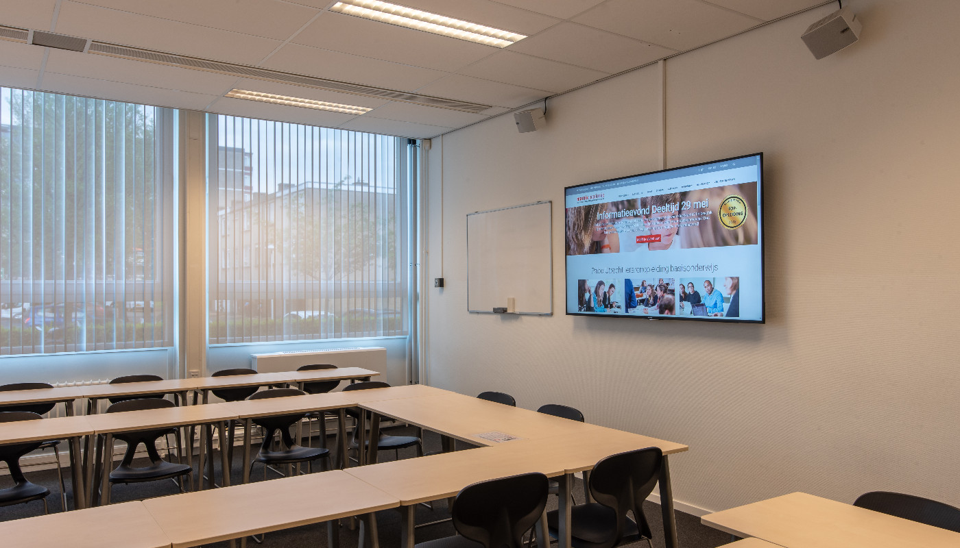 Naast de collegezaal hebben we ook alle lokalen voorzien van bediening door middel van knoppenpanelen. Een mooi gegeven aan dit project is de betrokkenheid van de gebruikers. Elke gebruiker mocht zelf aangeven of hij/zij graag interactief wilde kunnen presenteren. De interactieve lokalen hebben we vervolgens uitgerust met monitoren van Sharp. De standaard lokalen zonder interactieve beeldschermen hebben we uitgerust met Sony monitoren.