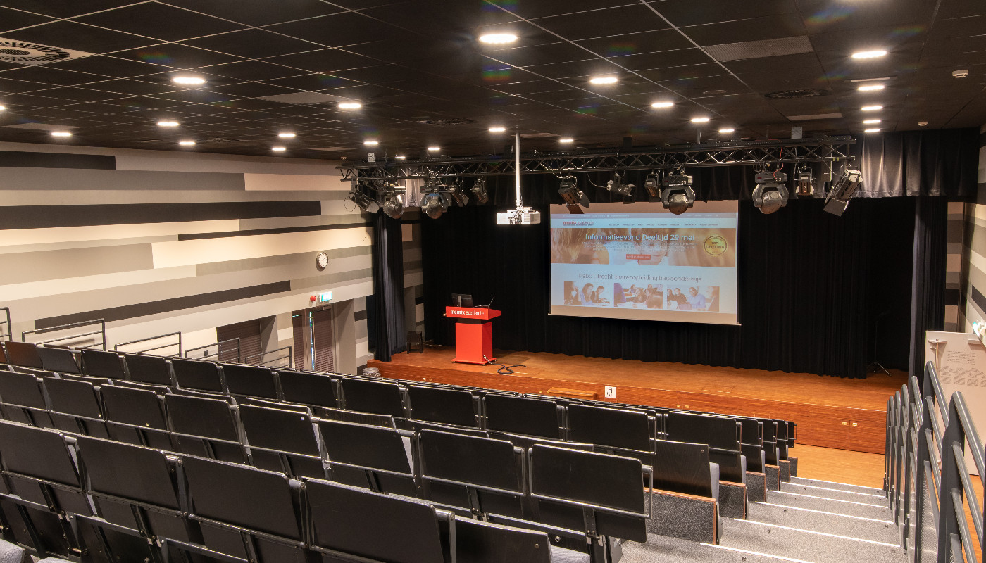 De collegezaal met 134 zitplaatsen is door de jaren heen constant vernieuwd en up-to-date gehouden. Naast een groot formaat projectie (400cm breed) is de ruimte eveneens voorzien van draadloze microfonie en hoogwaardige luidsprekers voor de geluidsweergave.