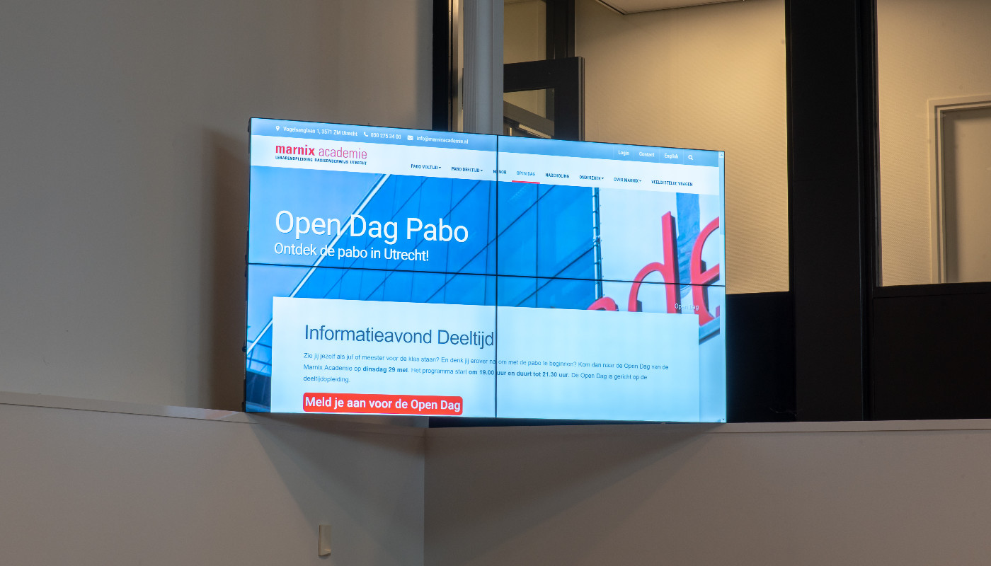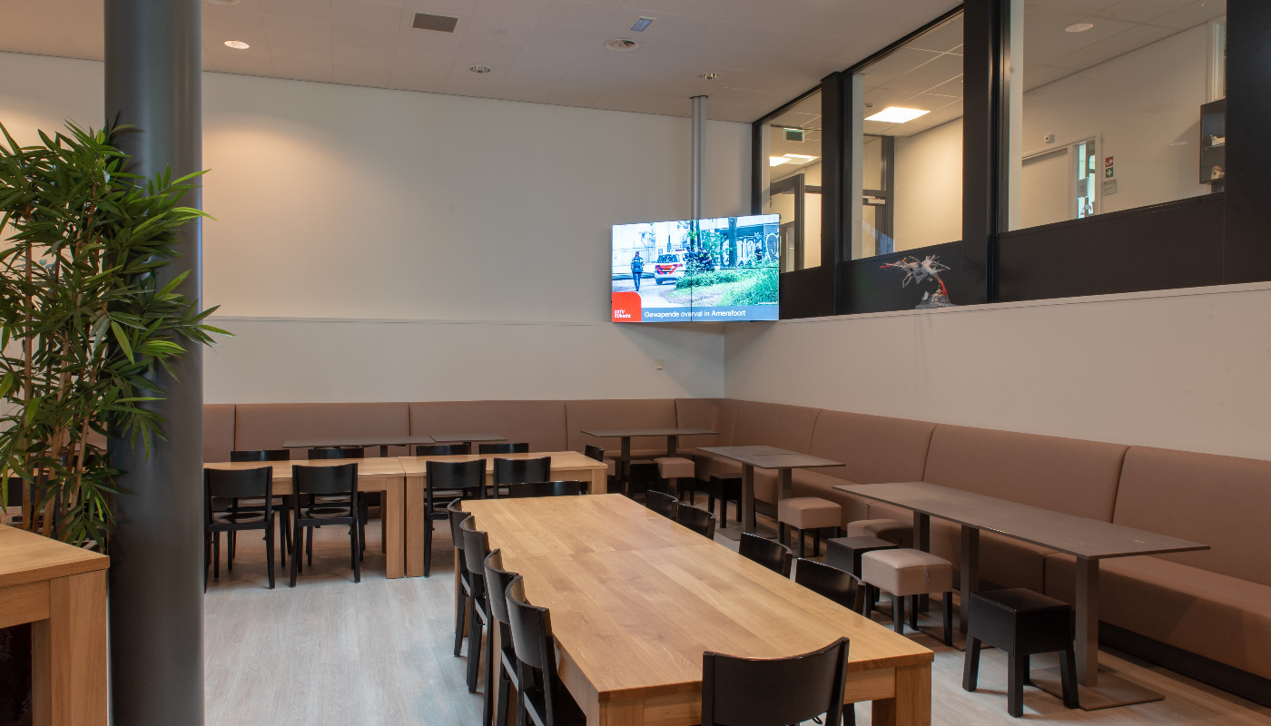 Tot slot wordt er op drie locaties in de school gebruikt gemaakt van digital signage, waarbij de geplaatste videowall in het restaurant het meest in het oog springt. Voor weergave van onder andere rooster informatie hebben we narrowcasting software van TiC narrowcasting toegepast.