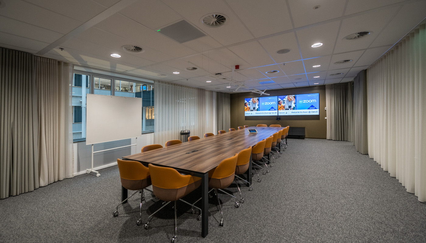 Voor collaboratie doeleinden is er gestandaardiseerd op ZOOM videoconferencing. Hiervoor zijn er in ongeveer 20 andere presentatieruimten voorzien in zogenoemde Zoom Room systemen. Een Zoom Room systeem bestaat uit een camera, microfoon, Mac mini en een iPad voor de bediening. Afhankelijk van de grootte van de ruimte is er gekozen voor diverse maatvoeringen voor de beeldweergave. Dit varieert van een single screen 48 inch tot maar liefst een dual screen 86 inch. Overigens is ook in deze ruimten gekozen voor Barco ClickShare. Voor meer informatie, kijk dan even naar de demo over Zoom Rooms.
