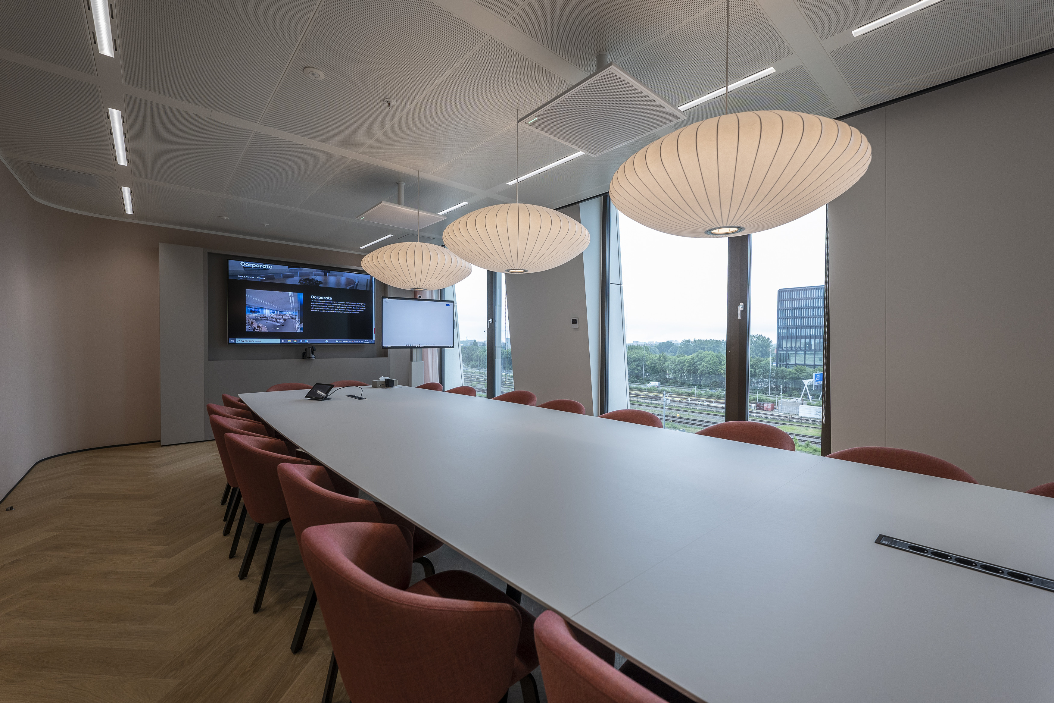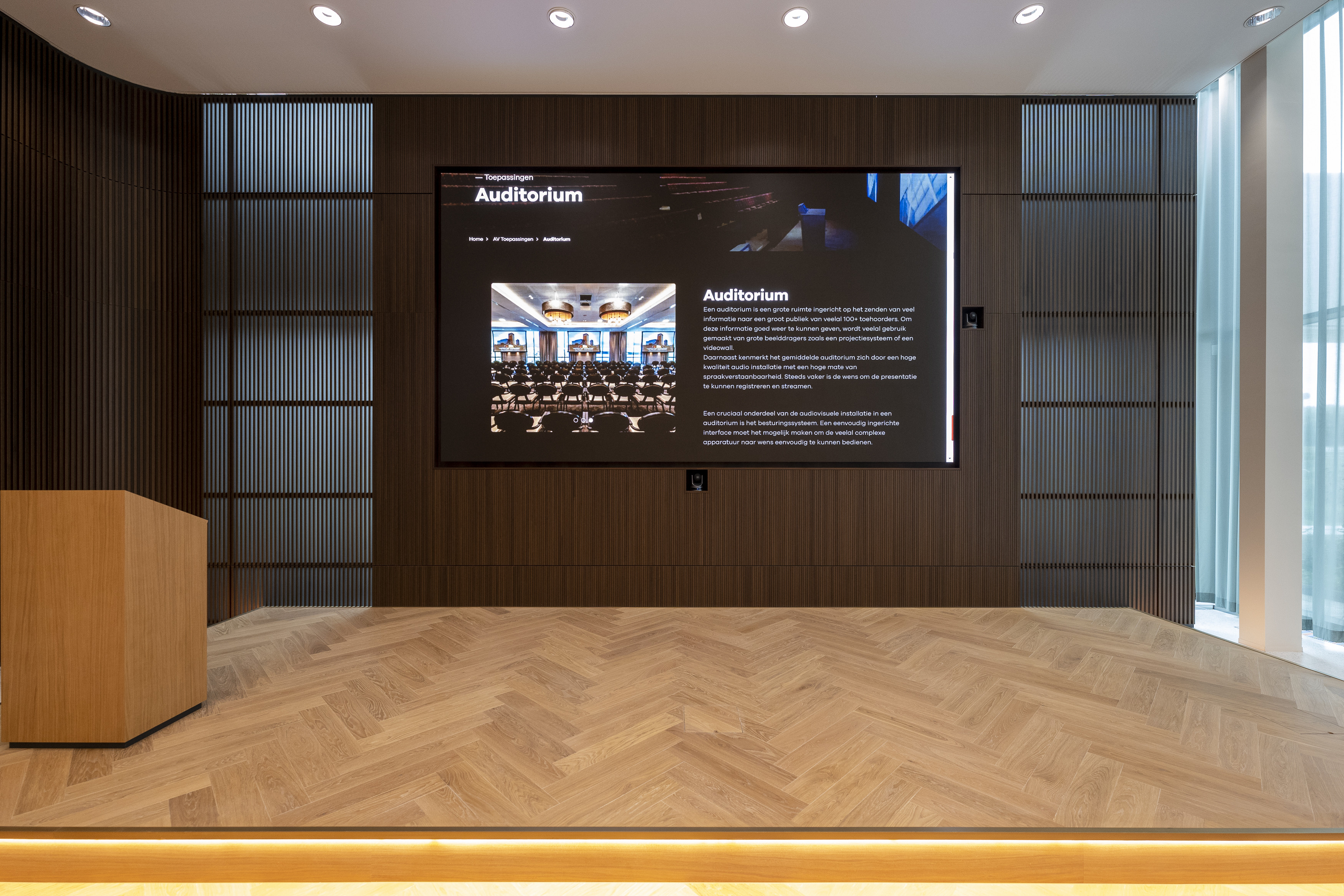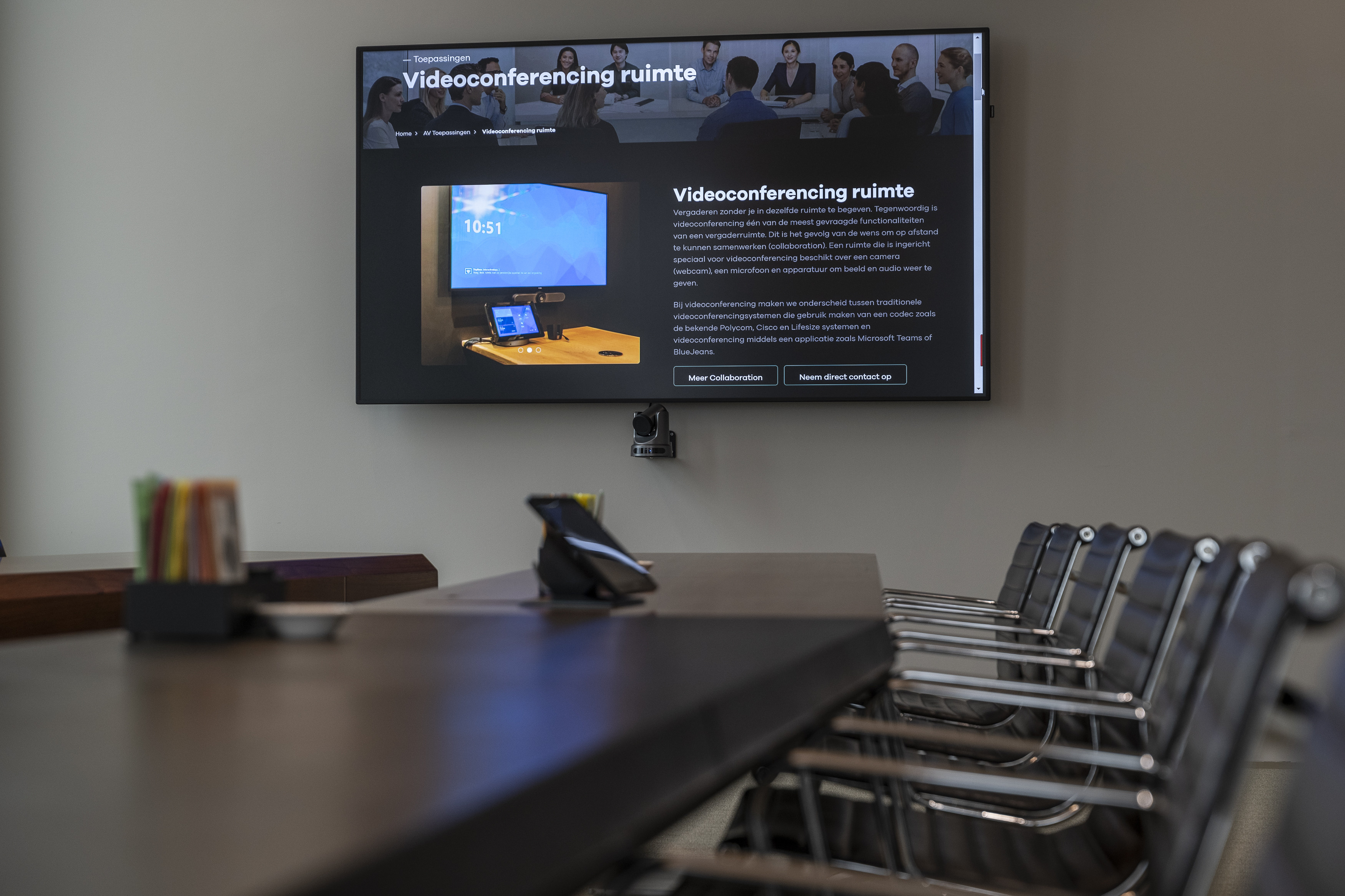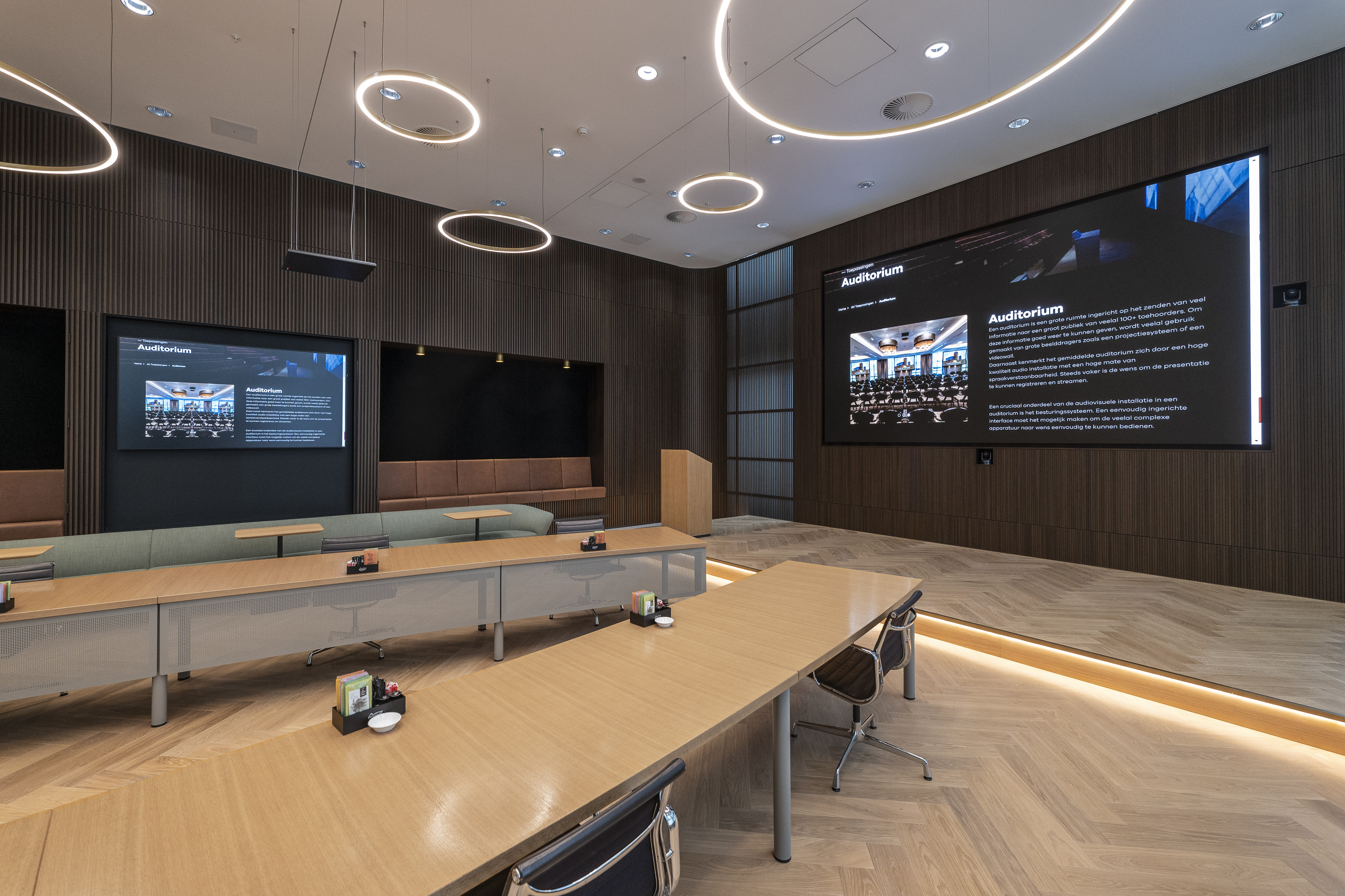 Het hoogtepunt van deze installatie is toch wel de indoor Samsung LED wall (1,5mm pixel pitch) van maar liefst 480 centimeter breed in de Boardroom. Deze Boardroom is tevens ondersteunend uitgerust met een 98 inch meekijk monitor en kan worden gecompleteerd met een Windows Surface Hub. Tevens is de Boardroom uitgerust met zwevende microfoons van Shure die zorgen voor een strakke uitstraling en tot wel 100 participanten in verschillende vergaderopstellingen kan versterken. Daarnaast kan de microfonie worden uitgebreid met draadloze microfoons. Het viertal PTZ camera's brengen de ruimte perfect in beeld en maken remote Teams bijeenkomsten mogelijk. Vanzelfsprekend biedt het systeem ook een opname mogelijkheid om op een later gewenst tijdstip de complete bijeenkomst op het gemak terug te kijken.