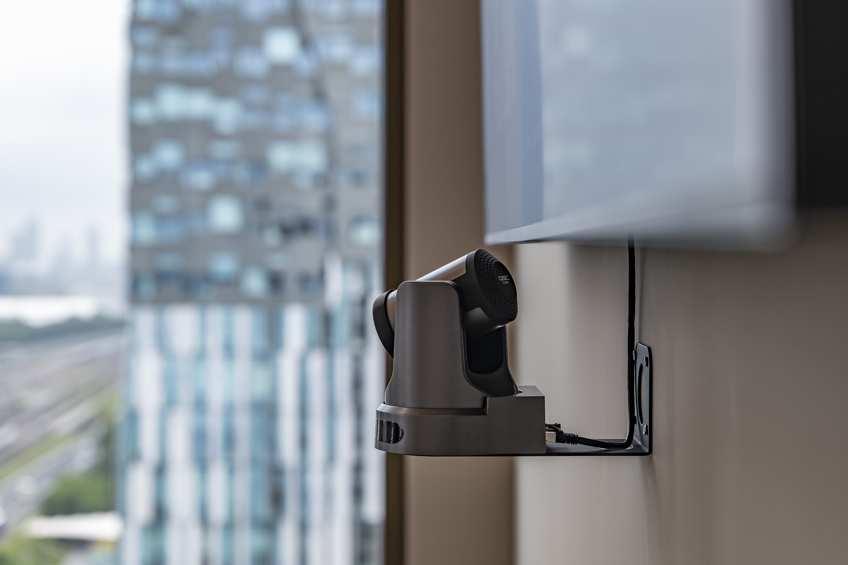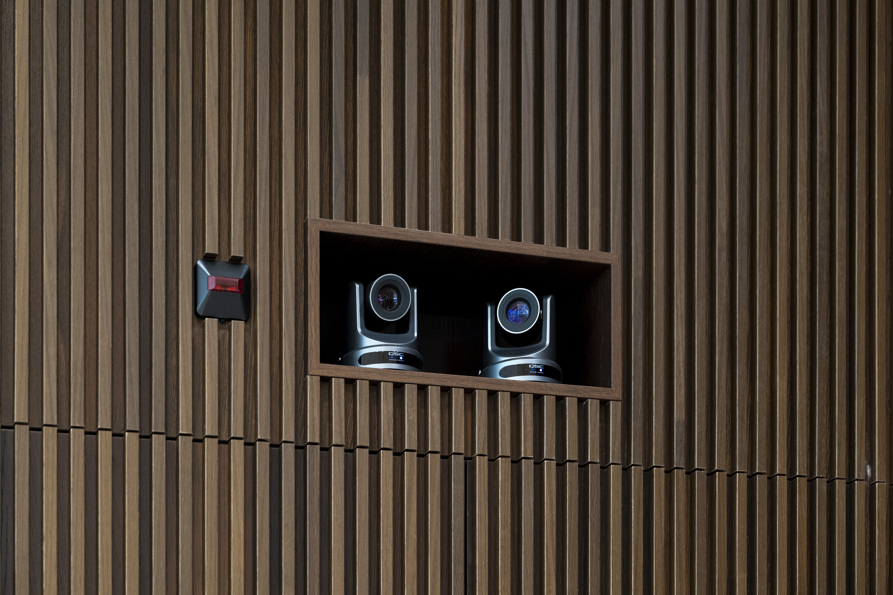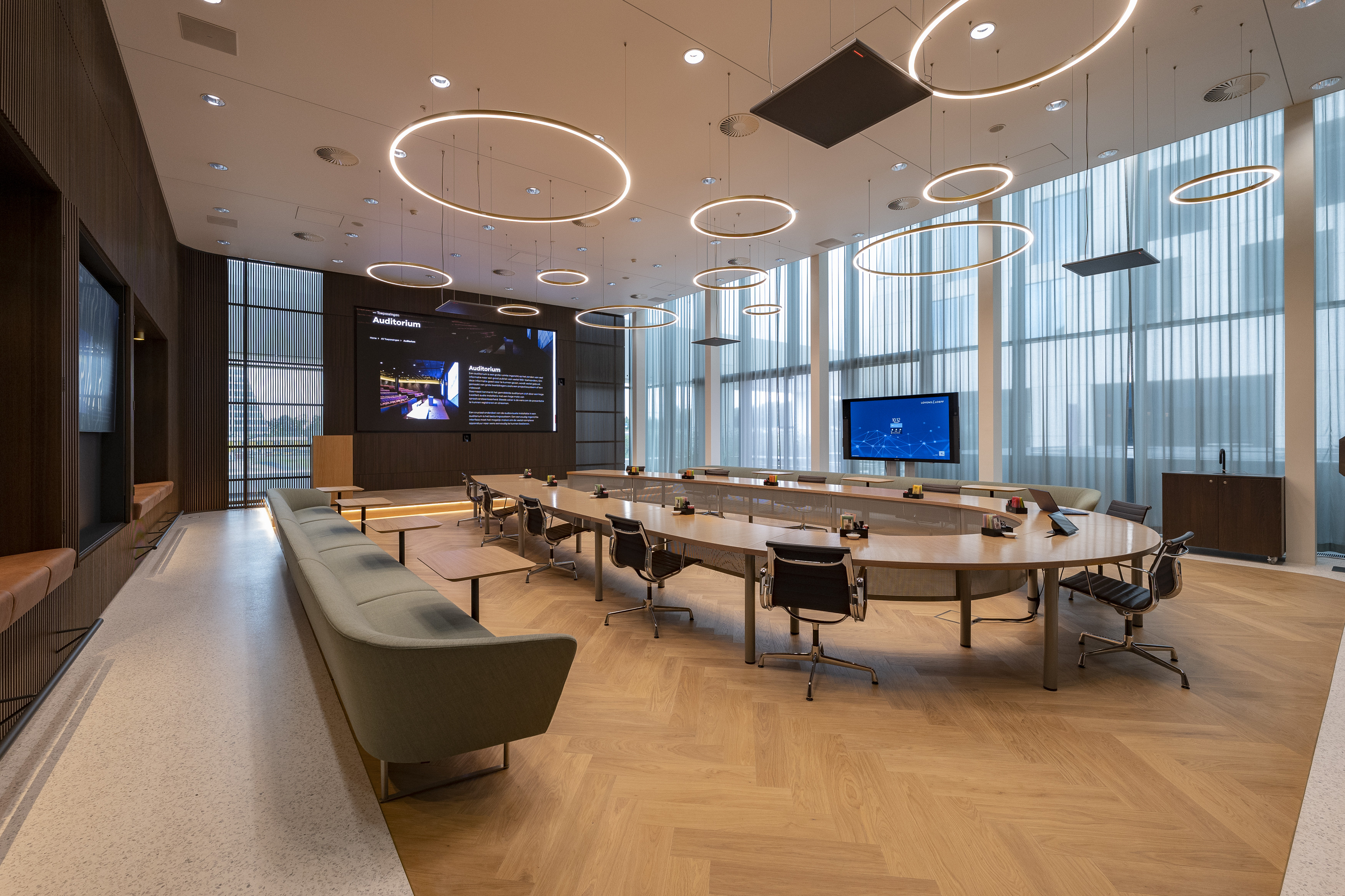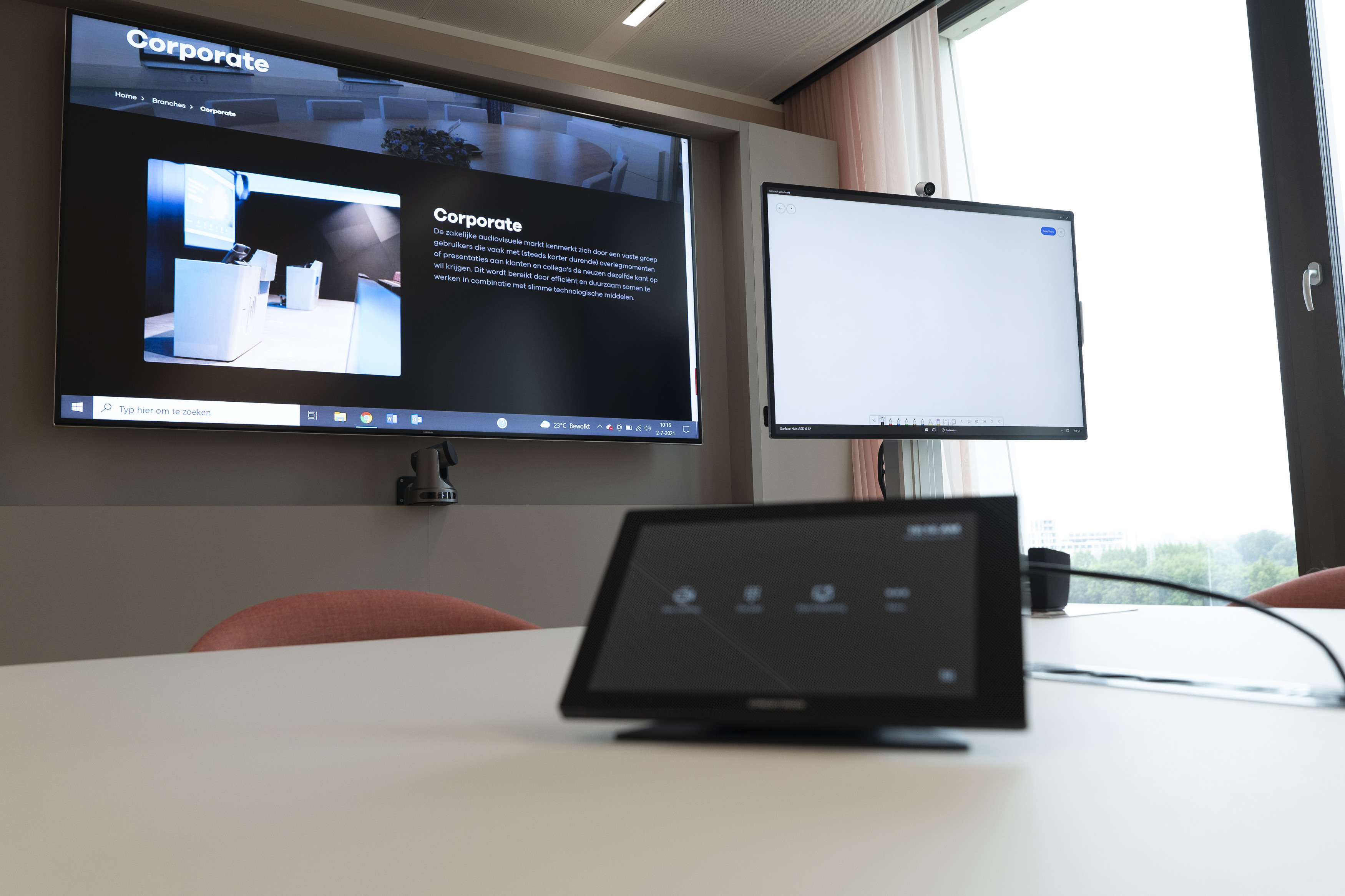 Het hoogtepunt van deze installatie is toch wel de indoor Samsung LED wall (1,5mm pixel pitch) van maar liefst 480 centimeter breed in de Boardroom. Deze Boardroom is tevens ondersteunend uitgerust met een 98 inch meekijk monitor en kan worden gecompleteerd met een Windows Surface Hub. Tevens is de Boardroom uitgerust met zwevende microfoons van Shure die zorgen voor een strakke uitstraling en tot wel 100 participanten in verschillende vergaderopstellingen kan versterken. Daarnaast kan de microfonie worden uitgebreid met draadloze microfoons. Het viertal PTZ camera's brengen de ruimte perfect in beeld en maken remote Teams bijeenkomsten mogelijk. Vanzelfsprekend biedt het systeem ook een opname mogelijkheid om op een later gewenst tijdstip de complete bijeenkomst op het gemak terug te kijken.