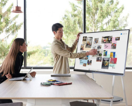 Een beeldscherm dat op de tafel staat of aan de muur hangt en waarmee makkelijk de verschillende “devices” draadloos of draadgebonden geconnecteerd kunnen worden. Zo kun je presentaties tonen of “inbellende” deelnemers de presentatie laten zien.